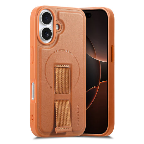 iPhone 16 Hard Plastic Case with Faux Leather Back & Finger Strap - MagSafe Compatible - Brown