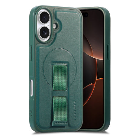 iPhone 16 Hard Plastic Case with Faux Leather Back & Finger Strap - MagSafe Compatible - Green
