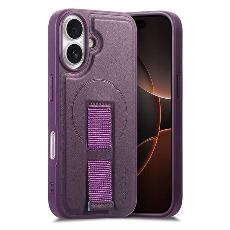 iPhone 16 Hard Plastic Case with Faux Leather Back & Finger Strap - MagSafe Compatible - Purple