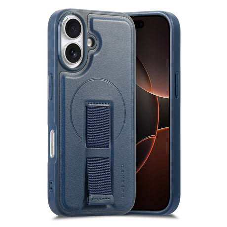 iPhone 16 Hard Plastic Case with Faux Leather Back & Finger Strap - MagSafe Compatible - Blue