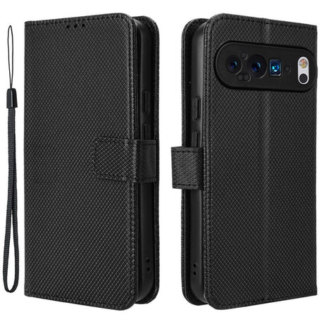 Google Pixel 9 / 9 Pro Leather Flip Case w. Strap & Texture - Black