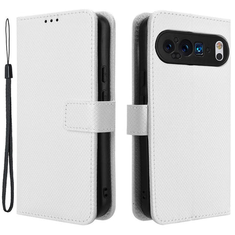 Google Pixel 9 / 9 Pro Leather Flip Case w. Strap & Texture - White