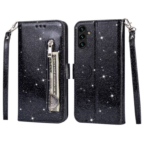 Samsung Galaxy S25 Glitter Flip Case with Zipper Pocket & Stand Function - Black