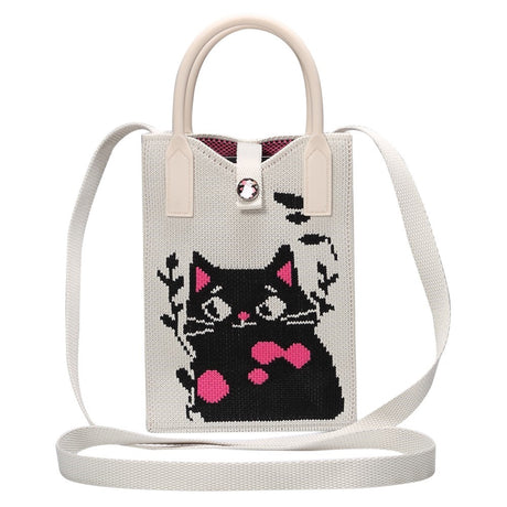 Knitted Crossbody Shoulder Bag with Hand Strap (180 x 120 mm) - Black Cat