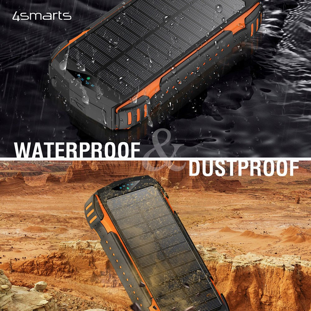 To charge this power bank in an environmentally friendly way, place the power bank in the sun with the solar cells facing up and charge the battery. It can also be charged using a data cable. With this 4smarts power bank, you can charge up to 4 devices at a time (20 watts distributed among the 4 devices).
