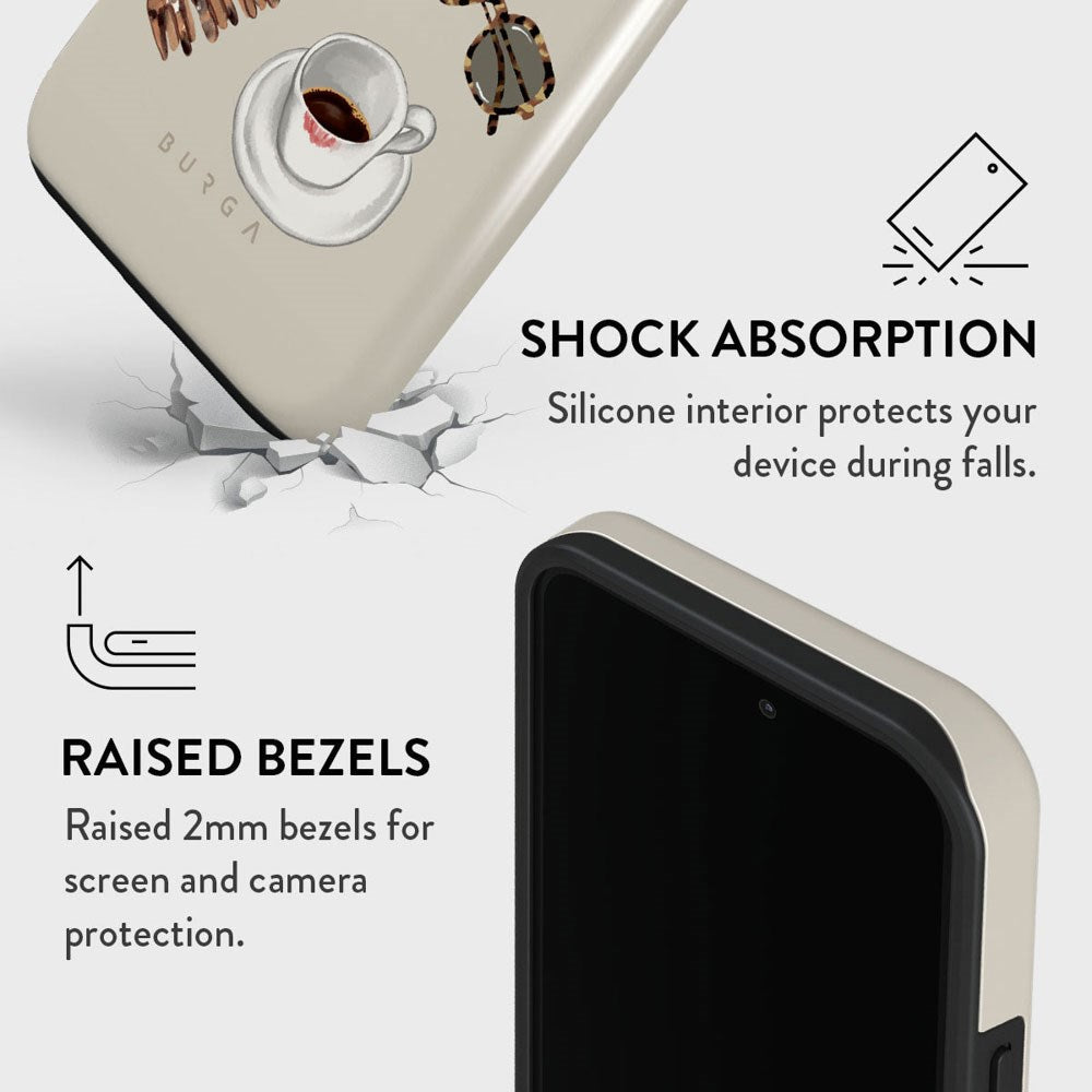 In combination with the case's exceptional visual design, Burga has given the case a unique protective function. The case is two-part, with an outer shell made of hard plastic and an inner layer made of highly protective shock-absorbing silicone.