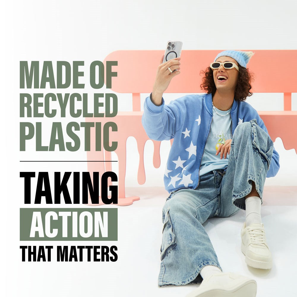 The case for iPhone 16 is made from recycled plastic and has openings for the speaker, camera, and flash, as well as allowing for charging while the case is on.