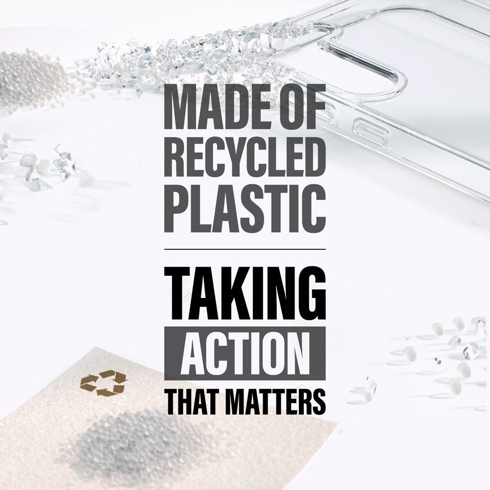The case for iPhone 16 Pro Max is made from recycled plastic and has openings for the speaker, camera, and flash, as well as allowing for charging while the case is on.