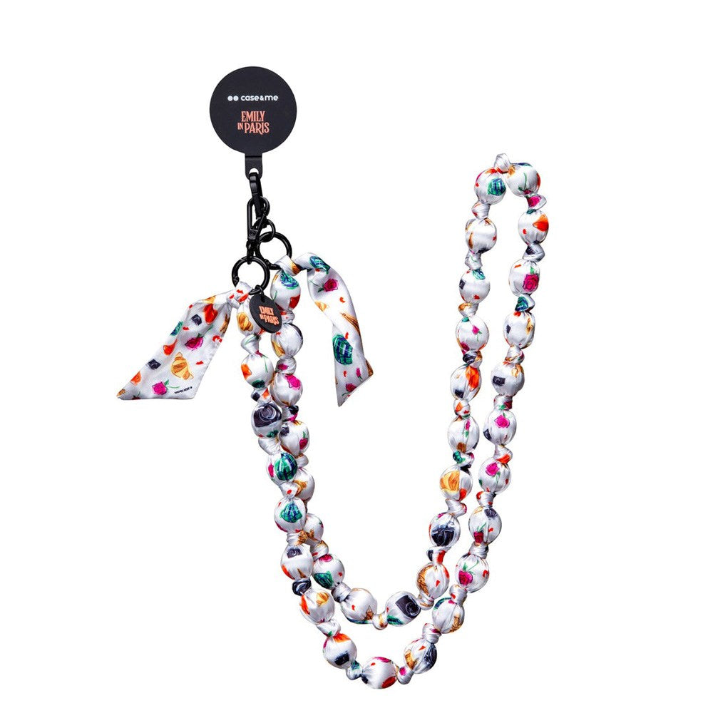 The phone necklace consists of a series of beads covered with woven fabric to form a scarf, perfectly fitting into the 'Emily in Paris' universe. Additionally, the phone necklace is designed with various motifs, such as the Eiffel Tower, croissants, flowers, and other Parisian designs.