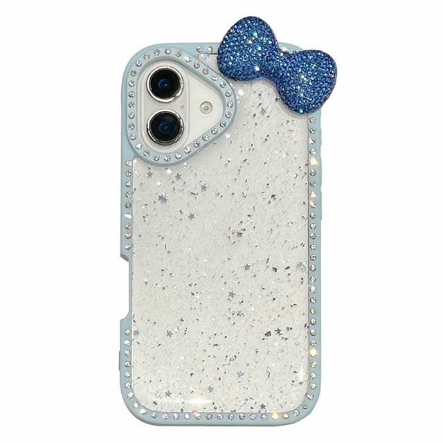 iPhone 16 Hybrid Case with 3D Bow and Rhinestones - Transparent / Blue