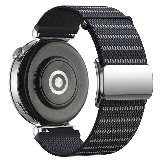 The strap is made from woven nylon, a lightweight and breathable material that ensures all-day comfort. The design includes an adjustable magnetic metal closure for easy customisation. Reflective threads are integrated into the material to increase visibility in the dark, enhancing safety during outdoor activities.