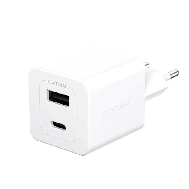 This wall charger from empower by PanzerGlass is designed for efficient charging of your devices. With a total output of 35W and both a USB-C and a USB-A port, it can charge multiple devices simultaneously. The charger supports fast charging, making it a practical solution for keeping your devices powered. It is equipped with an EU plug for use in standard wall outlets.