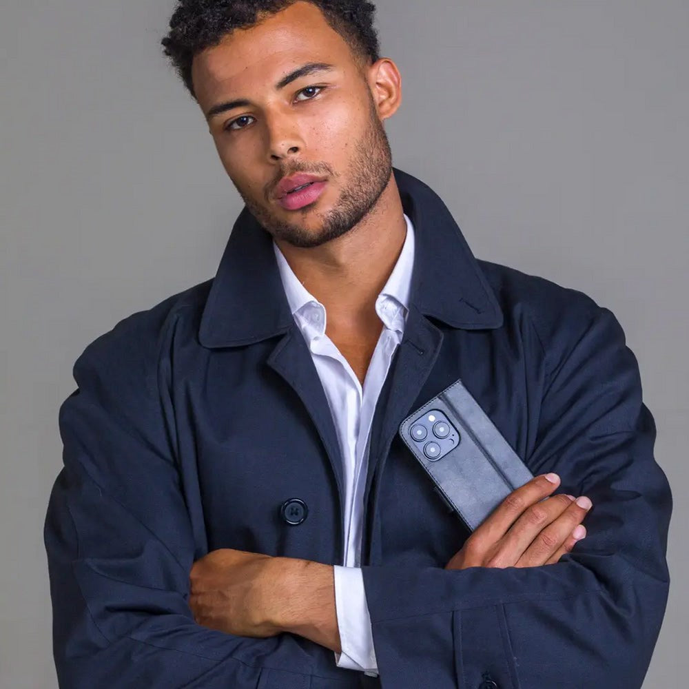 On the left side of the case there is room for three credit cards, and behind them, is a larger pocket for cash or receipts. On the right side of the flip case is a plastic case where the phone can be inserted. There are cutouts for the camera, buttons, speaker and charging port, so that all the phone's functions are accessible. The case also has a stand function, so the phone can stand on its own, and is compatible with wireless chargers.
