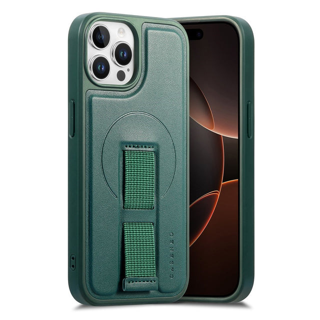 iPhone 12 / 12 Pro Hard Plastic Case with Faux Leather Back & Finger Strap - MagSafe Compatible - Green