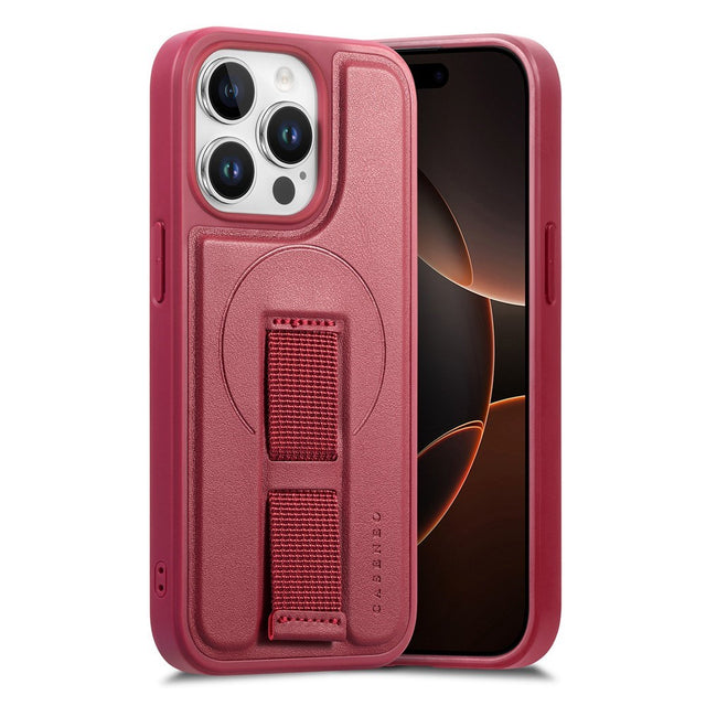 iPhone 13 Pro Hard Plastic Case with Faux Leather Back & Finger Strap - MagSafe Compatible - Red