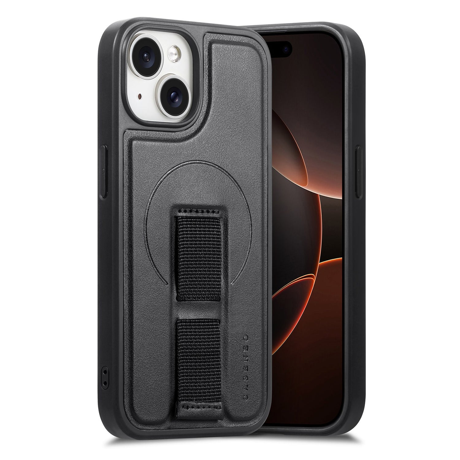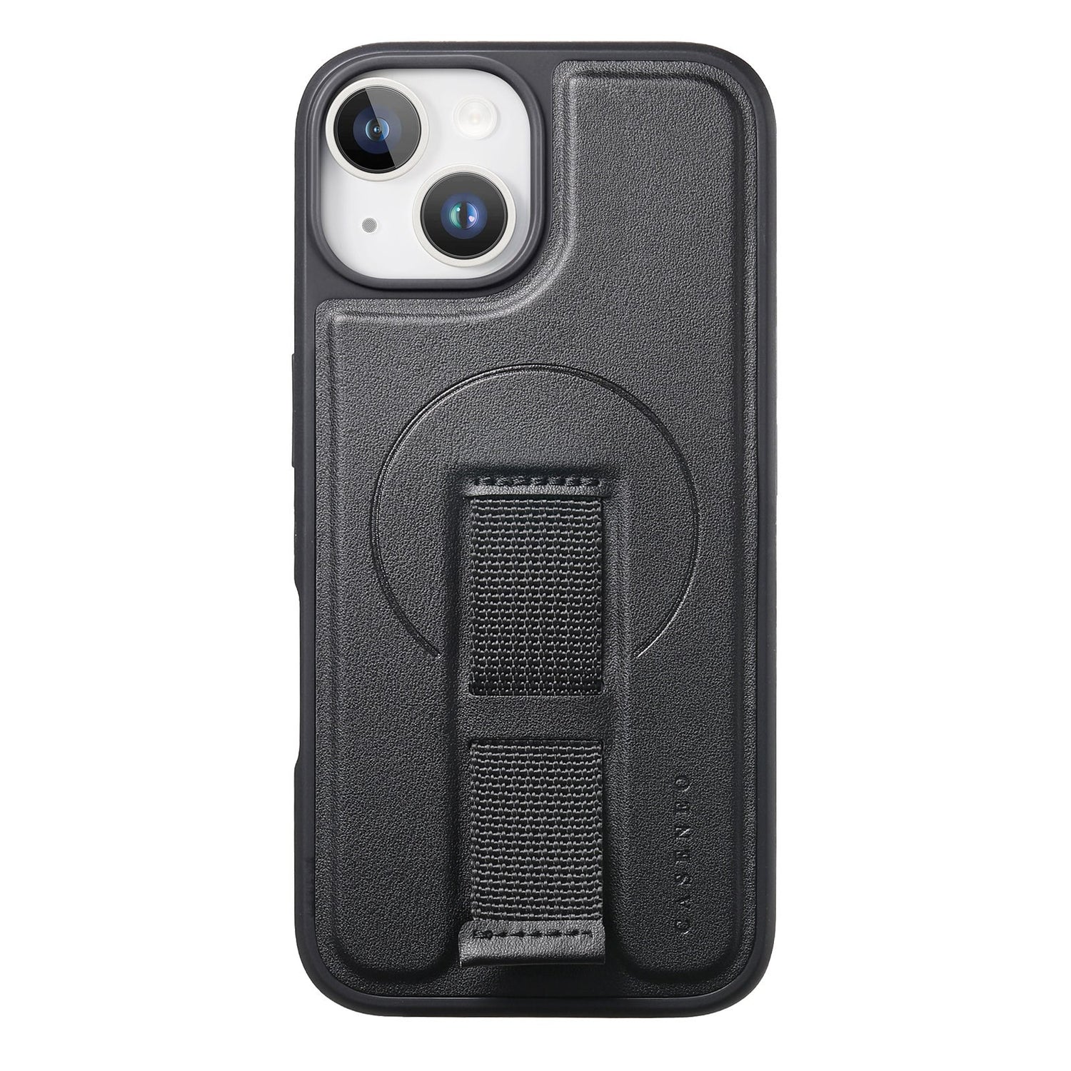 iPhone 14 / 13 Hard Plastic Case with Faux Leather Back & Finger Strap - MagSafe Compatible - Black