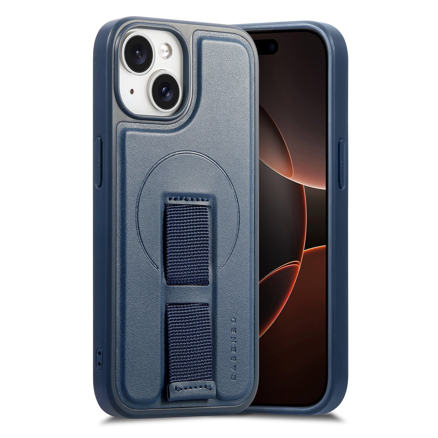 iPhone 14 / 13 Hard Plastic Case with Faux Leather Back & Finger Strap - MagSafe Compatible - Blue