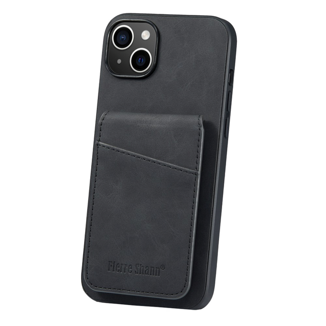 This case for the iPhone 14 has shock-absorbing edges and a back made of hard plastic, covered with artificial leather.