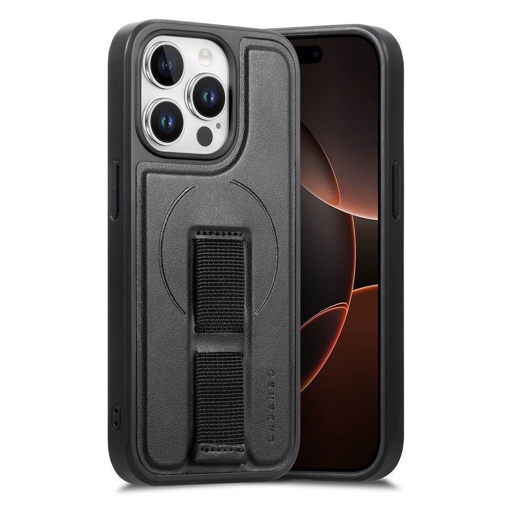 iPhone 14 Pro Hard Plastic Case with Faux Leather Back & Finger Strap - MagSafe Compatible - Black