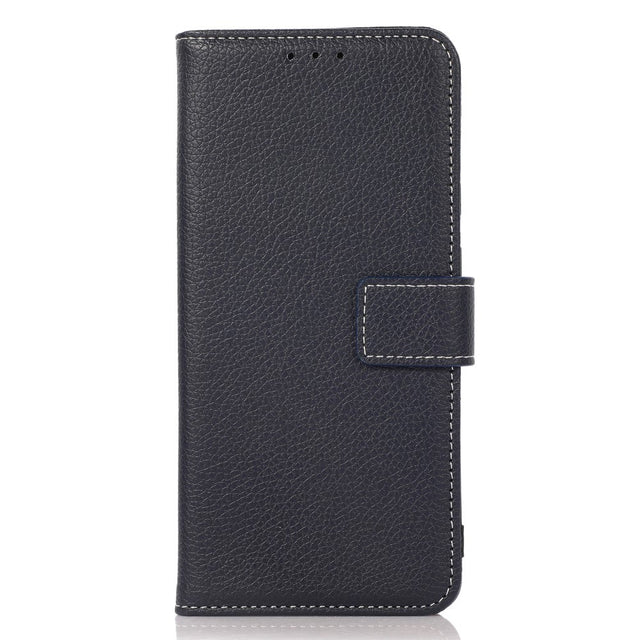 iPhone 15 Litchi Leather Flip Cover w. White Stitches and Wallet - Blue