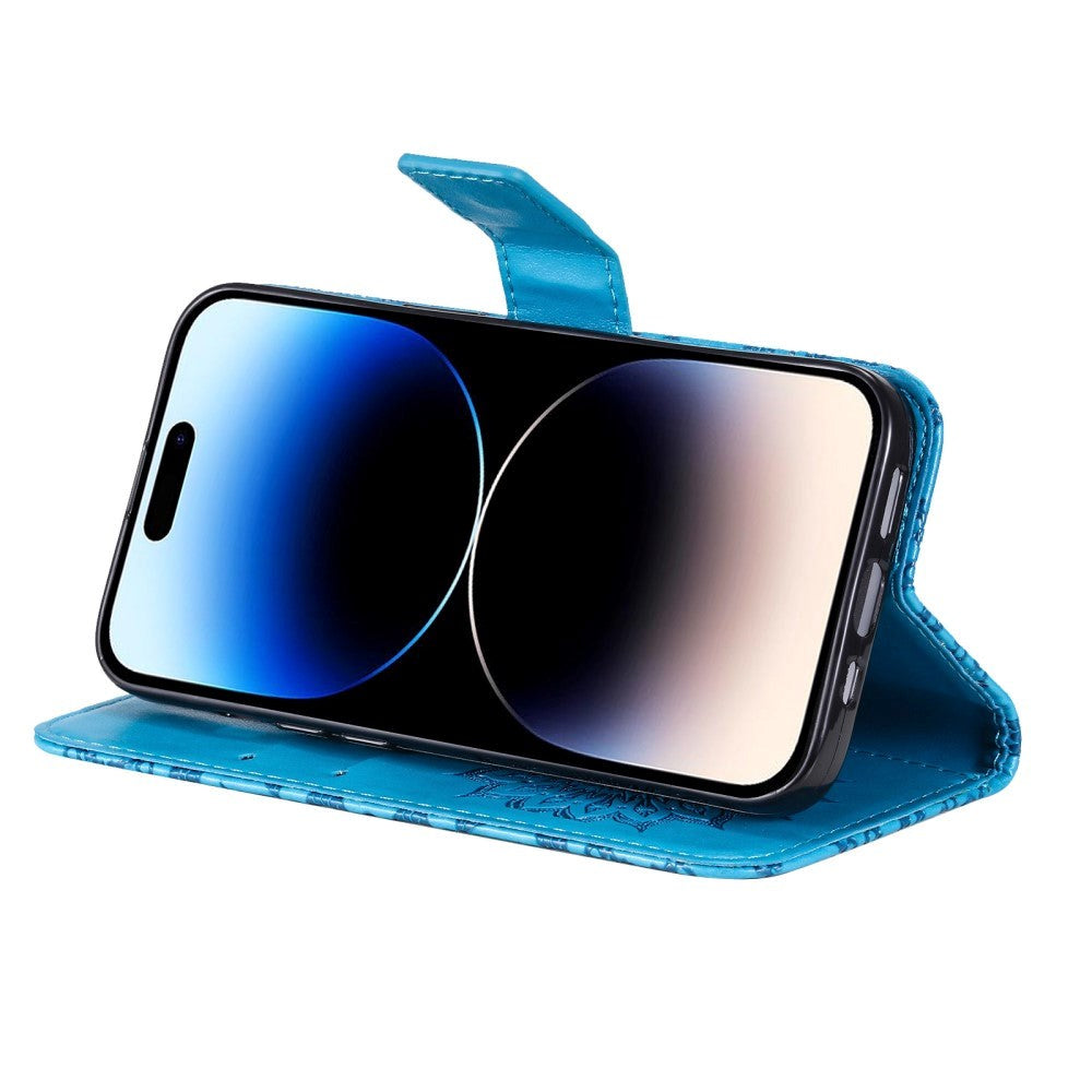 iPhone 15 Pro Leather Case with Wallet and Strap - Mandala Flower - Blue