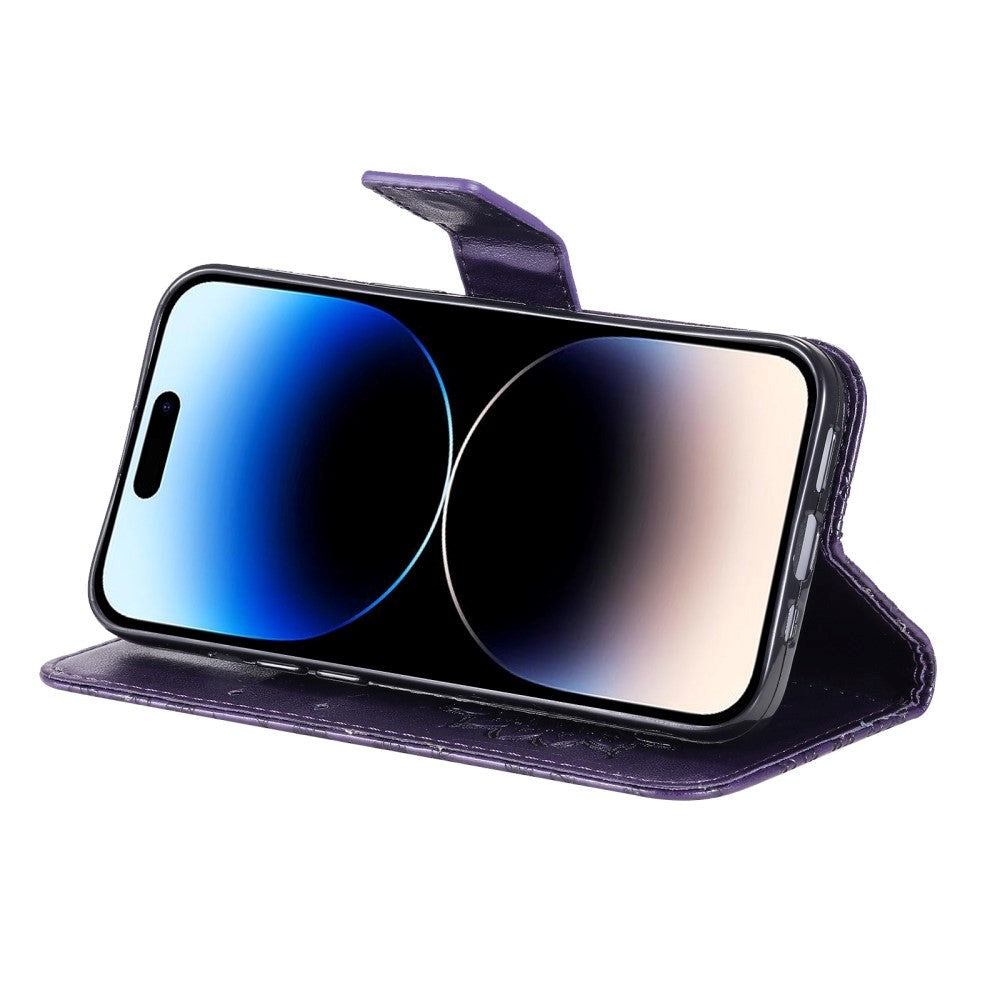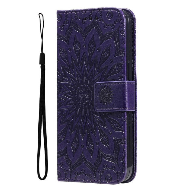iPhone 15 Pro Leather Case with Wallet and Strap - Mandala Flower - Purple