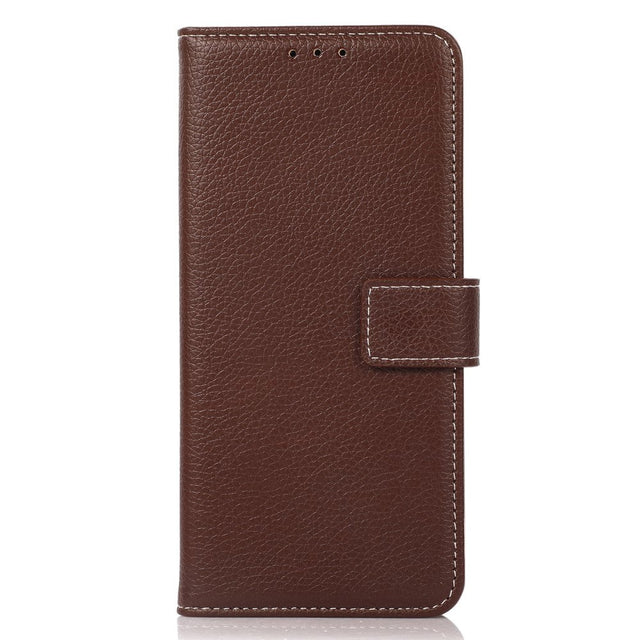 iPhone 15 Pro Litchi Leather Flip Cover w. White Stitches and Wallet - Brown