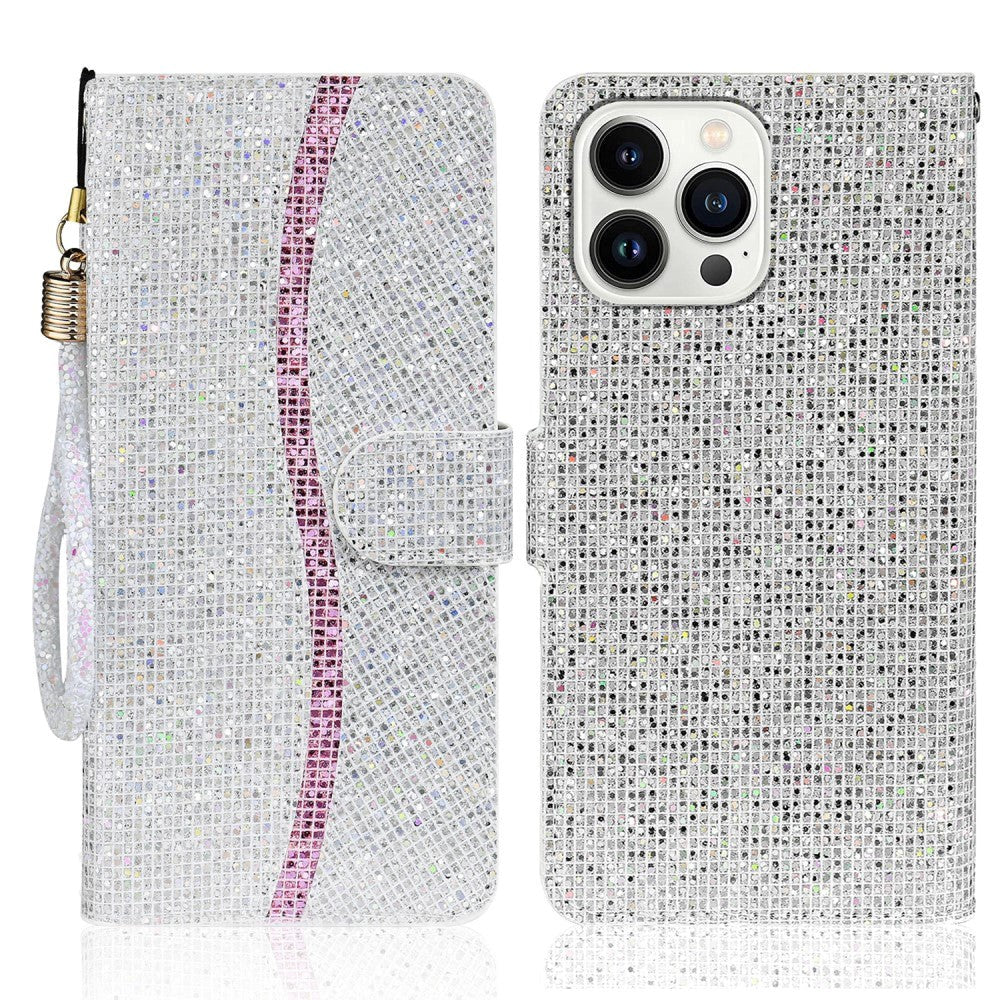 iPhone 15 Pro PU Leather Flip Case with Wallet & Strap - Glitter Design - Silver