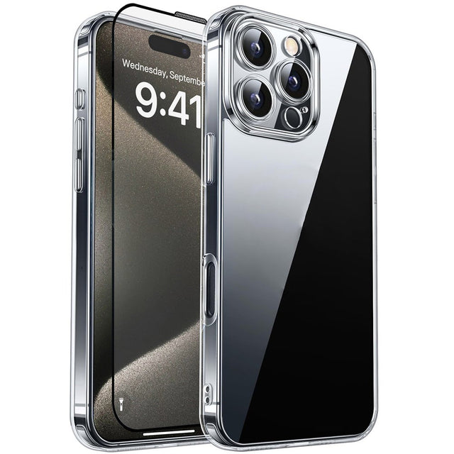 Give your iPhone 15 Pro full protection with this RURIHAI 2-in-1 Protection Set, combining a crystal-clear, flexible plastic case and an aluminum-silicon glass screen protector.