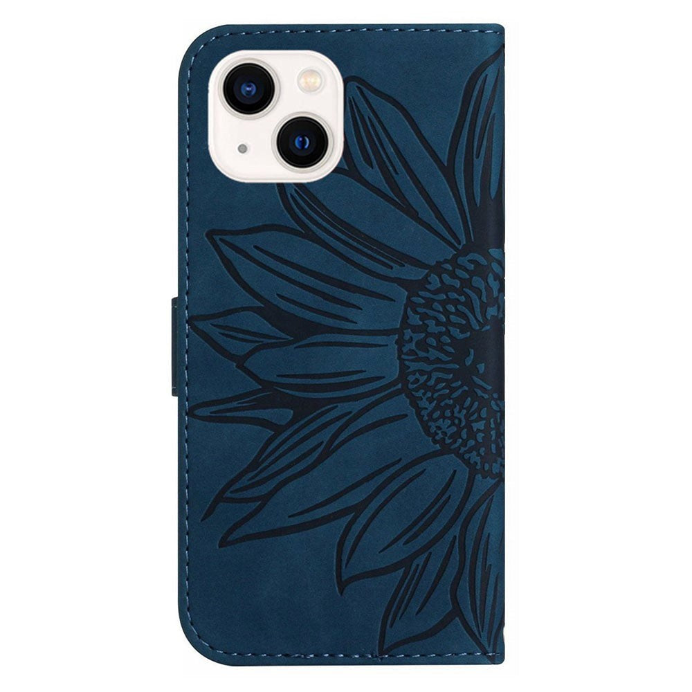 iPhone 15 Wallet Case w. Strap - Sunflower Engraving - Dark Blue