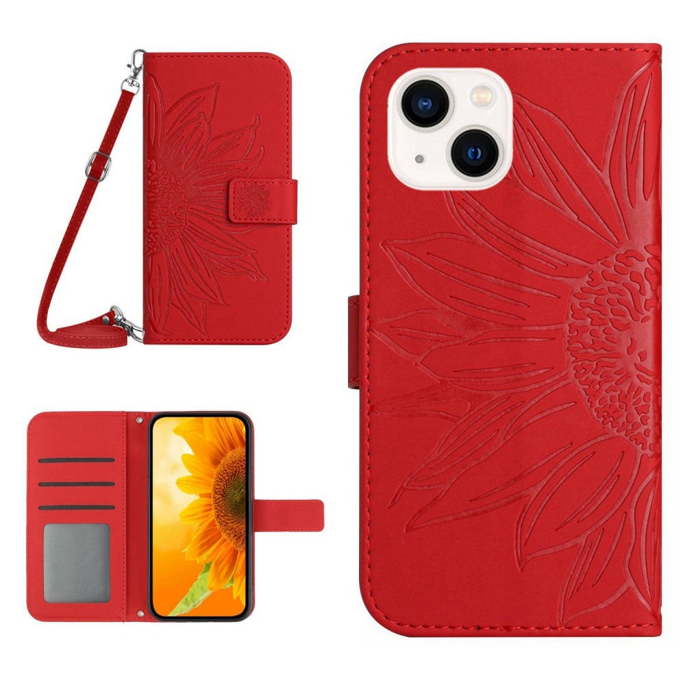 iPhone 15 Wallet Case w. Strap - Sunflower Engraving - Red