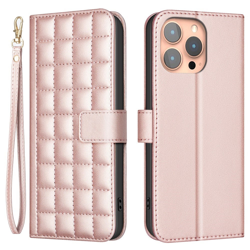 iPhone 16 Pro Checkered Leatherette Flip Wallet Case with Strap - Rose Gold