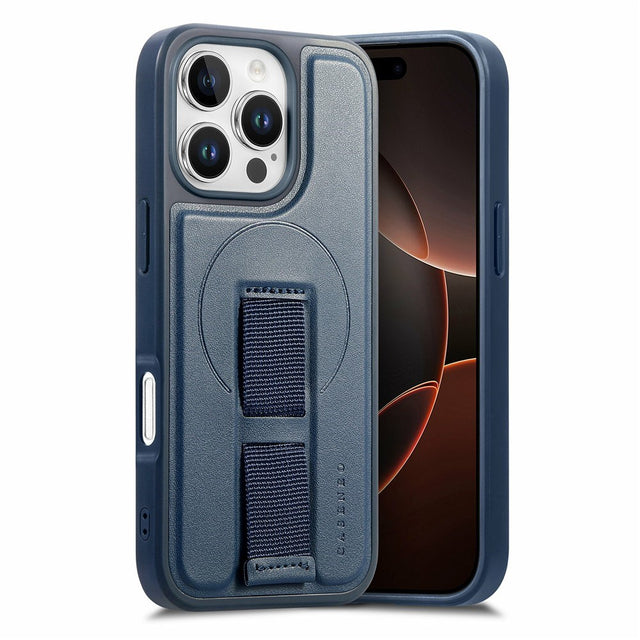 iPhone 16 Pro Hard Plastic Case with Faux Leather Back & Finger Strap - MagSafe Compatible - Blue