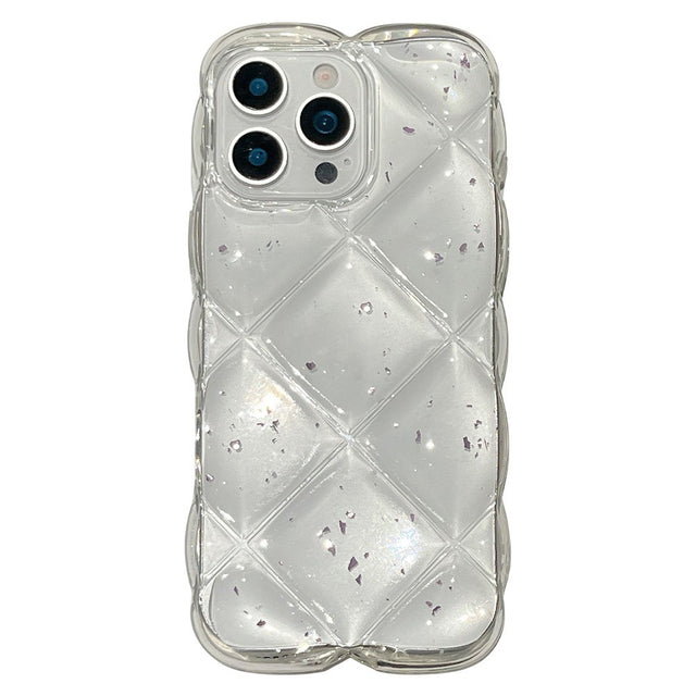 Made from a flexible plastic material that is both durable and pliable, which makes the case easy to install. The material provides a good grip on the phone, and its shock-absorbing properties distribute the energy from impacts. The transparent surface with a quilted pattern adds minimal bulk.