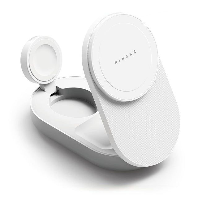 This 3-in-1 wireless charging stand from Ringke is designed to charge three devices simultaneously. It is equipped with a MagSafe charger, a charging pad for an Apple Watch, and a secondary wireless charging pad for accessories like earbuds.
