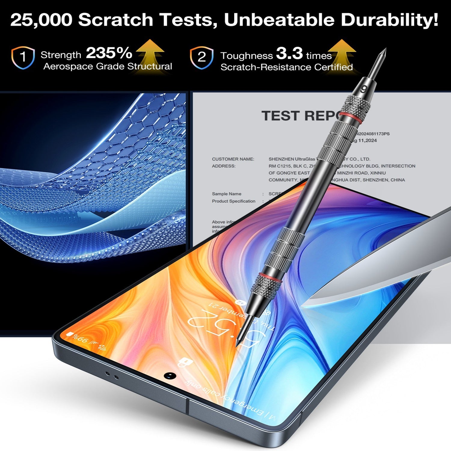 The screen protector is made from high-quality tempered glass and delivers up to 3x increased durability, effective protection against drops from up to 1.8 meters, and 10x higher shatter resistance. The glass absorbs shocks and reduces the risk of damage from everyday drops and impacts.