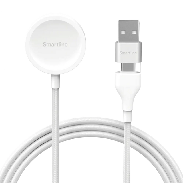 This charging cable from Smartline is designed for efficient charging of your Apple Watch. The cable is equipped with both a USB-C and a USB-A connector, providing great flexibility for connecting to various power sources. The magnetic connection ensures that the watch attaches easily and securely for a stable charge with a power output of 2.5W. It is a practical solution for keeping your watch fully charged.