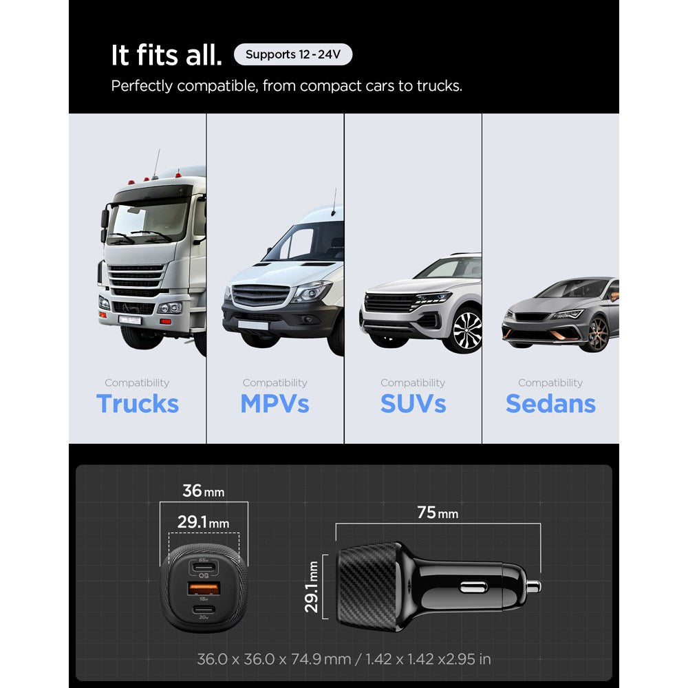 The car charger offers broad compatibility and three output options: USB-C (65W), USB-C (30W), and USB-A (18W), allowing you to charge multiple devices simultaneously.