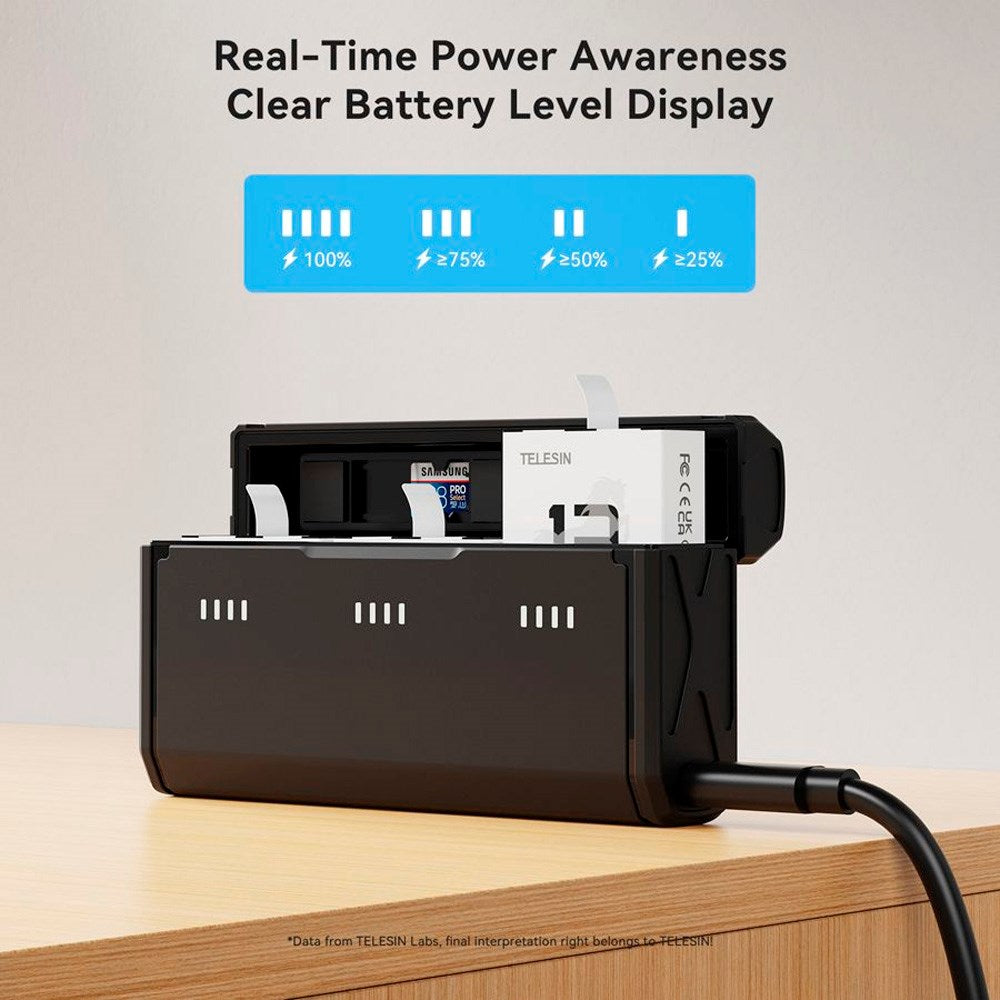 Make the most of your recordings with the TELESIN Battery Charging Case & 2x Stamina Battery Kit for GoPro Hero 13. This compact and durable charger can charge three batteries and store two microSD cards, so you always have extra power and storage with you.