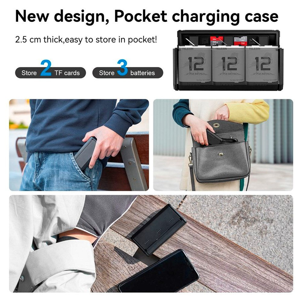 The smart 3-in-1 charging case functions as a charger, storage box, and protective case, making it perfect for both daily use and travel. With room for three batteries and a compact design, it fits easily in your pocket or camera bag.