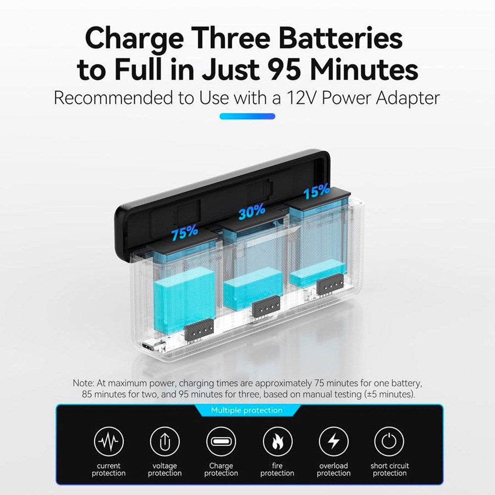With this TELESIN Battery Charging Case for DJI Osmo Action 3 / 4 / 5 Pro, you get a smart and efficient solution for keeping your camera batteries charged and organized. The case allows you to charge up to three batteries simultaneously, so you’re always powered up when you need it.