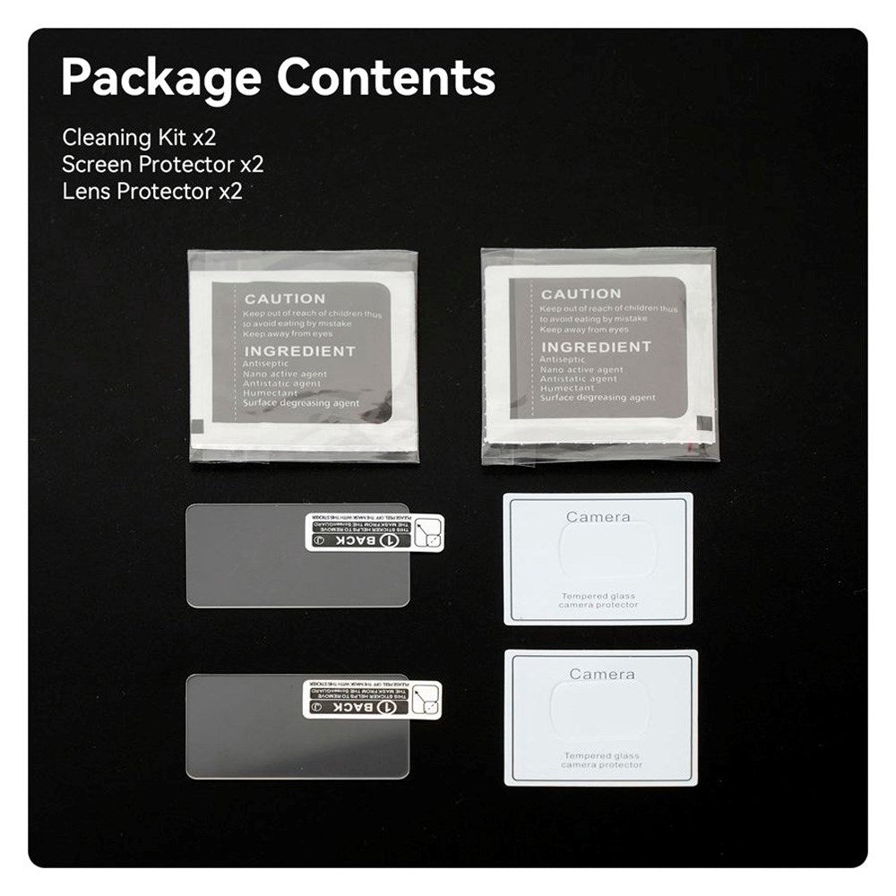 The set includes two protective film sets and cleaning kits, making it easy and convenient to replace the protection when needed. The precise fit and easy installation ensure the glass sits perfectly on the lens and screen without annoying bubbles.